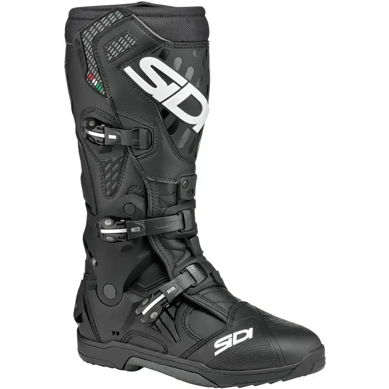 Une botte qui élève les standards. Utilisée par les pilotes professionnels en MX, Hard Enduro et Superenduro, la Crossair offre toute la solidité d'une botte Sidi haut de gamme dans seulement 1665 grammes (taille 43), ce qui la rend bien plus légère que toutes les autres. Un exosquelette interne renforcé en fibre de verre assure soutien et sécurité tout en conservant une construction incroyablement légère. Son composé de semelle, Materiis, a été développé en collaboration avec des pilotes professionnels pour offrir un nouveau niveau d'adhérence et de durabilité.