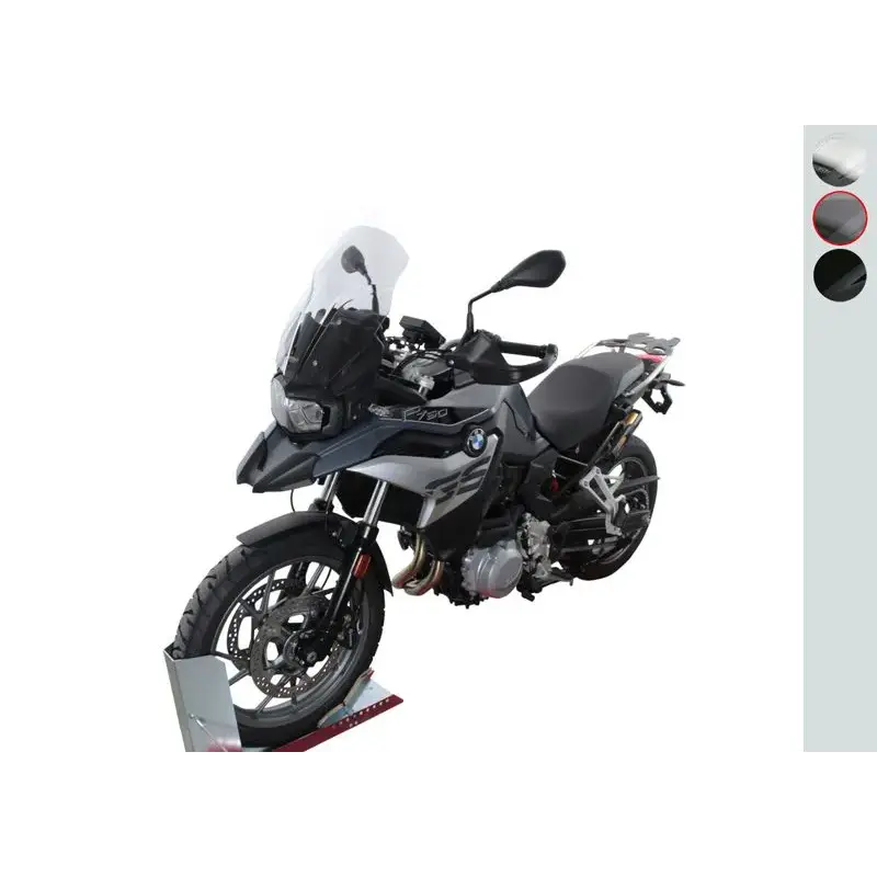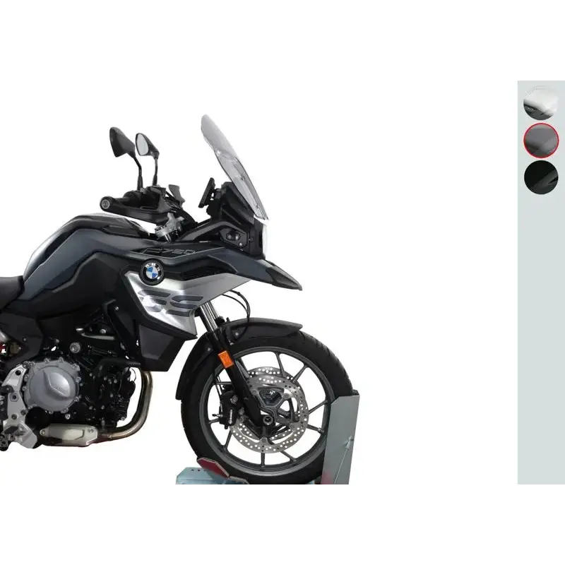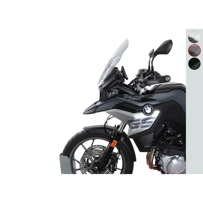 Convient pour support de pare-brise court. Ne convient pas au support de pare-brise long (F850GS) ! Le tout nouveau F750GS a rejoint la classe moyenne aventure dans le secteur des vélos pour débutants. Cependant, il est basé sur la même plate-forme que le 850GS. Cela signifie que le "petit" 750cc peut faire beaucoup plus que ce que les chiffres sur papier pourraient suggérer. Pratiquement aucune moto ne peut offrir autant de luxe dans la classe des débutants. Ici, le pare-brise touring (T) de 45 cm de long, disponible en incolore, gris fumé ou noir, offre une bonne protection contre la pression du vent gênante.