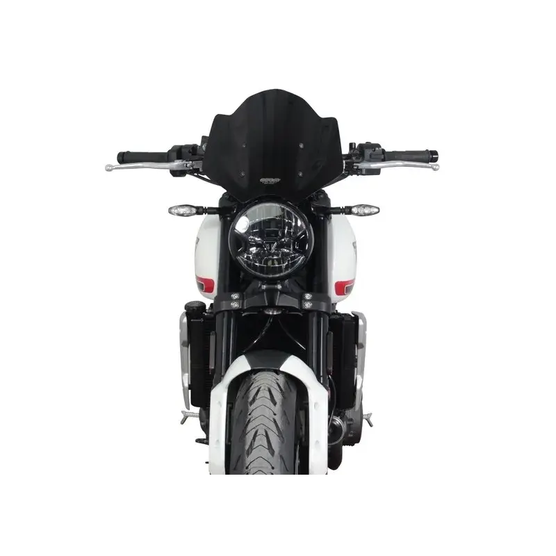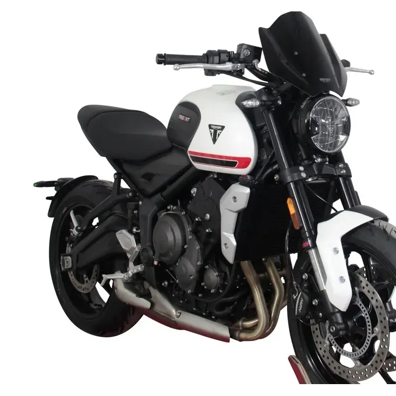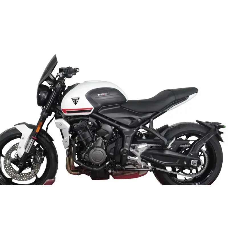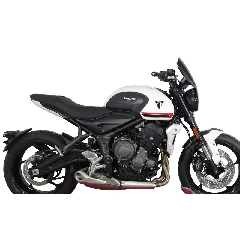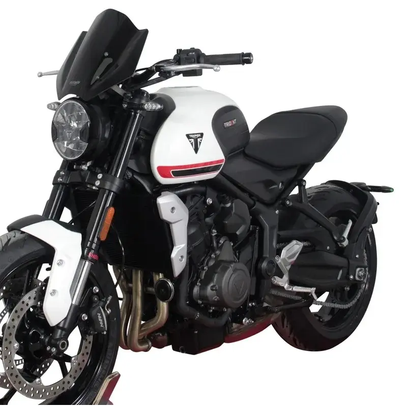 Le pare-brise sport de 30 cm de long (NSPM) de MRA augmente sensiblement le confort de conduite en soulageant le pilote de la pression du vent. Le Trident - à mi-chemin entre le moderne et le classique - sera adapté à une utilisation quotidienne avec le pare-brise sport qui, dans les différentes couleurs (incolore, gris fumé, noir) et avec sa découpe ronde inférieure, s'adapte très bien au phare rond. Le matériel de montage et les instructions sont inclus dans la livraison.