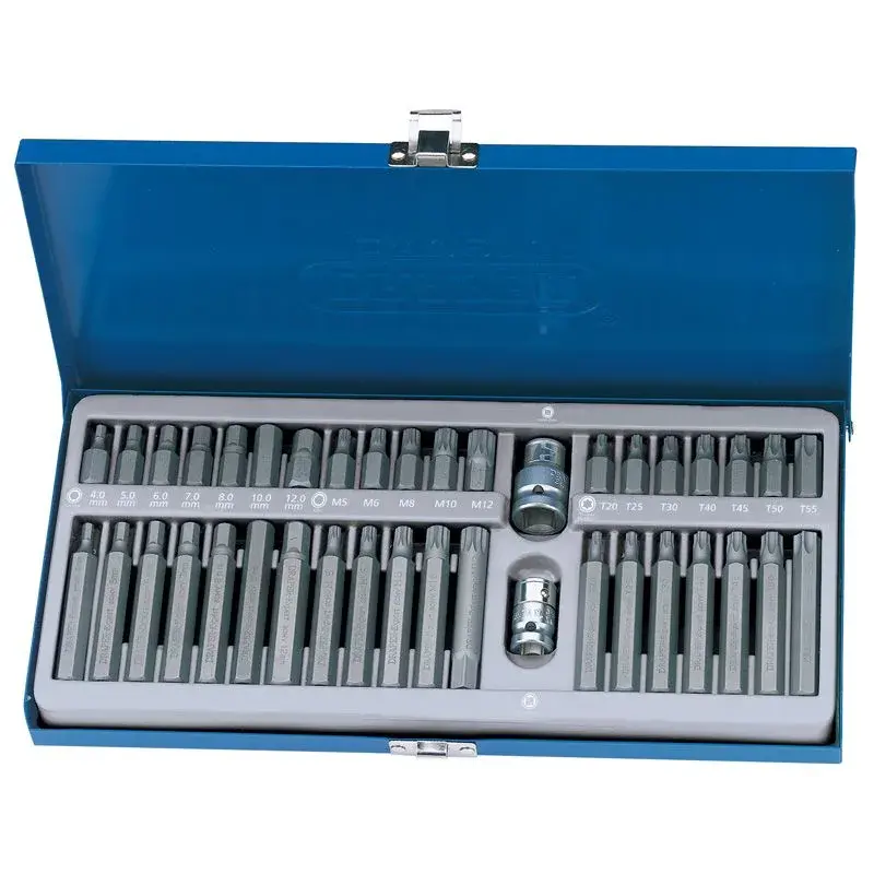 Coffret de 40 douilles et embouts en Qualité Expert, embouts conçus en acier S2, trempés et sablés. Douilles porte embout en acier trempé, traités au chrome vanadium. Livré dans un coffret métallique.