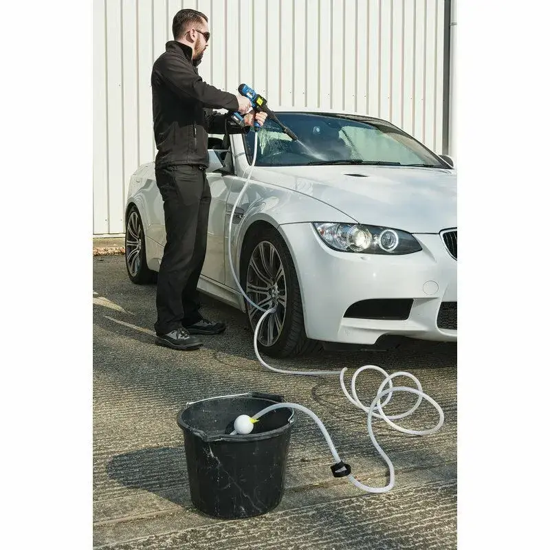 - Fourni avec 6m de tuyau auto-amorçant, bidon de savon, lance et extension de lance