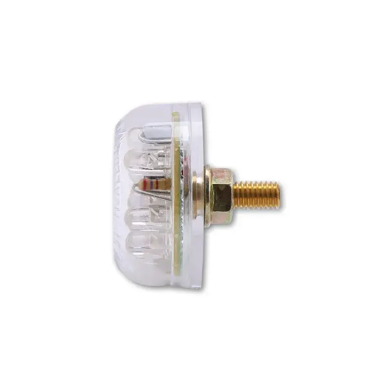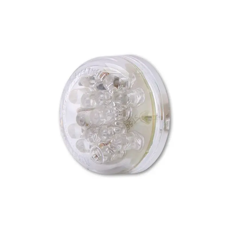 Petit corps rond avec verre clair, fonction feu stop et feu de route, marquage E.