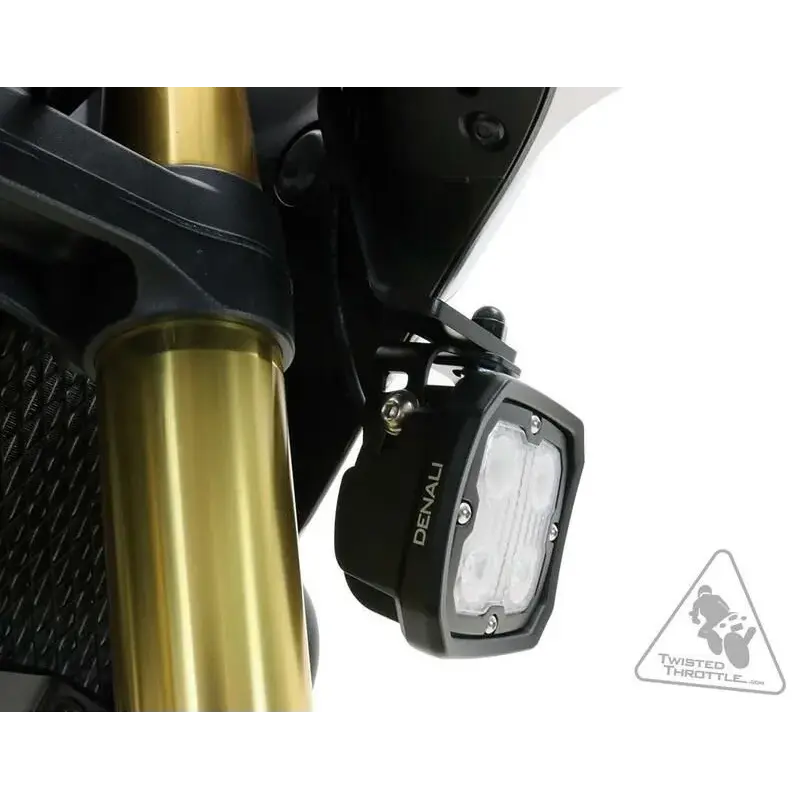 Le support d'éclairage DENALI permet l'ajout d'éclairages additionnels. Fabriqué en acier découpé au laser, ce support s'ajuste précisément sous le carénage avant, sans découpe, perçage ou autres modifications nécessaires. Ce support polyvalent est compatible avec les kits d'éclairages DENALI DM, D2, DX, D4 et DR1 LED ainsi qu'avec la plupart des autres marques populaires.