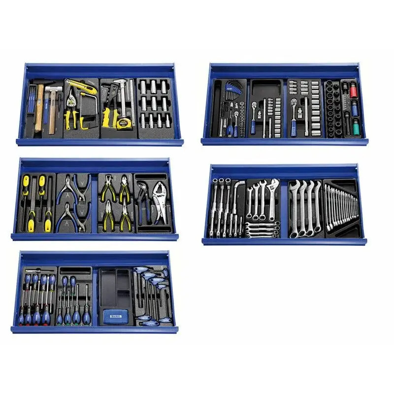 - Servante large 7 tiroirs équipée de 19 modules en plastiques et d'une clé dynamométrique (250 outils) pouvant accueillir 4 modules par tiroir.