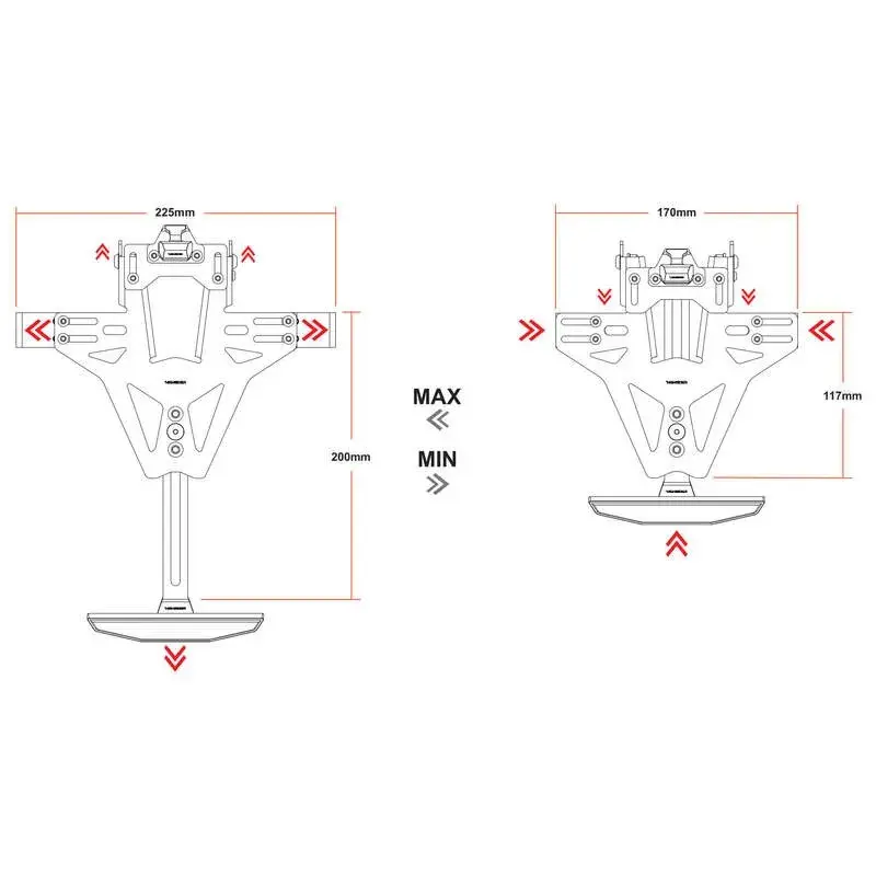 Les supports de clignotants AKRON-RS sont réglables en largeur et conviennent donc à tout type de clignotant. Cette option de réglage vous permet d'adapter la position de vos clignotants aux plaques d'immatriculation les plus diverses. Pour permettre le montage des clignotants sans les déconnecter du faisceau de câbles, les trous de 10 mm sont sur le côté.