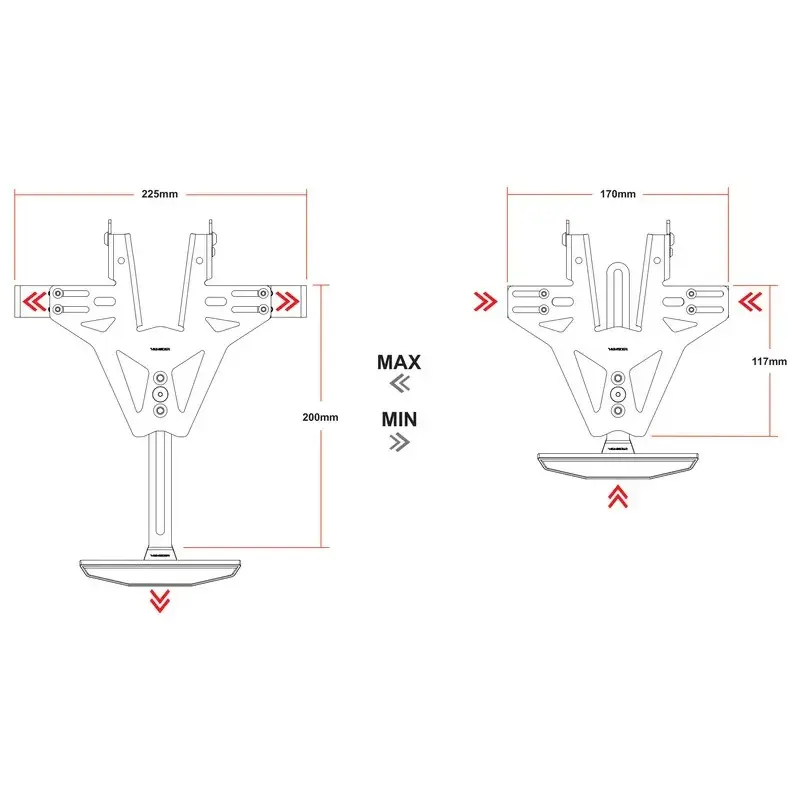 Les supports de clignotants AKRON-RS sont réglables en largeur et conviennent donc à tout type de clignotant. Cette option de réglage vous permet d'adapter la position de vos clignotants aux plaques d'immatriculation les plus diverses. Pour permettre le montage des clignotants sans les déconnecter du faisceau de câbles, les trous de 10 mm sont sur le côté.